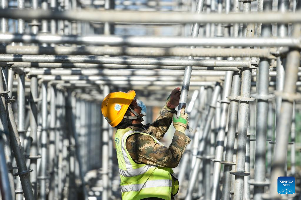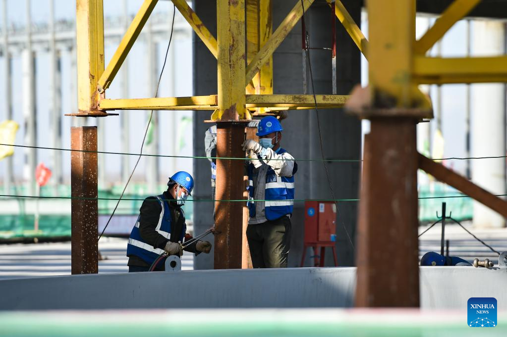 Workers work at the construction site of a new airport in Hohhot, capital of north China's Inner Mongolia Autonomous Region, March 30, 2022.