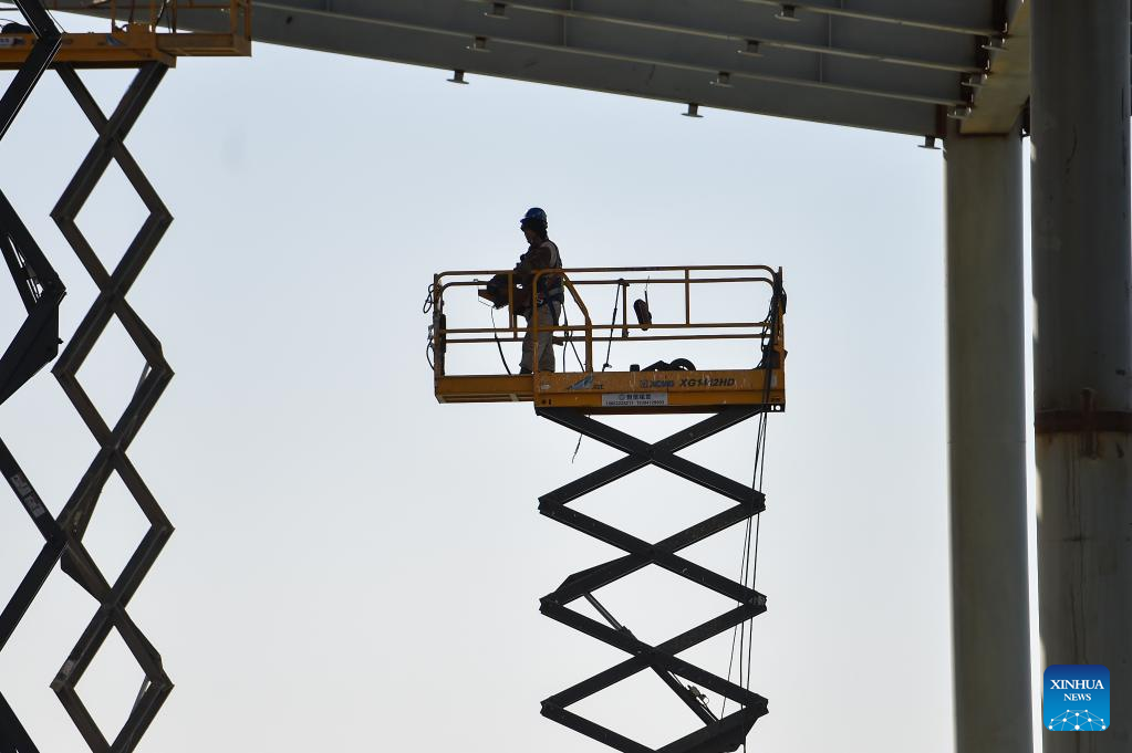 A worker works at the construction site of a new airport in Hohhot, capital of north China's Inner Mongolia Autonomous Region, March 30, 2022.