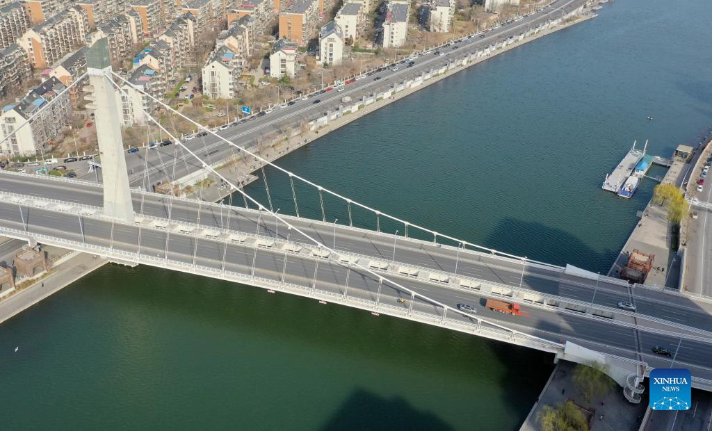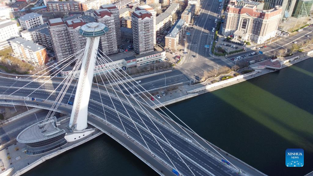 Aerial photo taken on March 26, 2022 shows the Guotai bridge over the Haihe River in north China's Tianjin. (Xinhua/Li Ran)