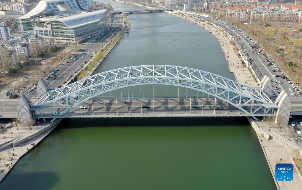 Aerial photo taken on March 27, 2022 shows the Yongle bridge over the Haihe River in north China's Tianjin. (Xinhua/Sun Fanyue)