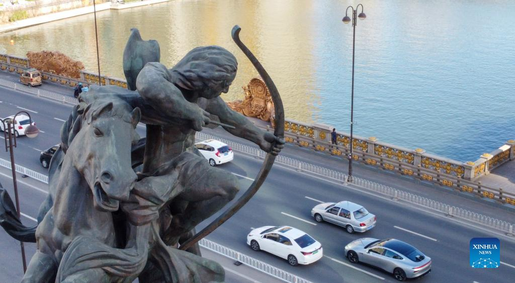 Aerial photo taken on March 27, 2022 shows the Jiefang bridge over the Haihe River in north China's Tianjin. (Xinhua/Li Ran)
