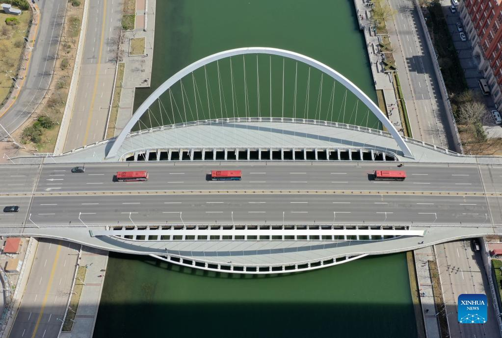 Aerial photo taken on March 27, 2022 shows the Chifeng bridge over the Haihe River in north China's Tianjin. (Xinhua/Sun Fanyue)