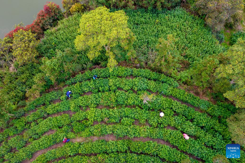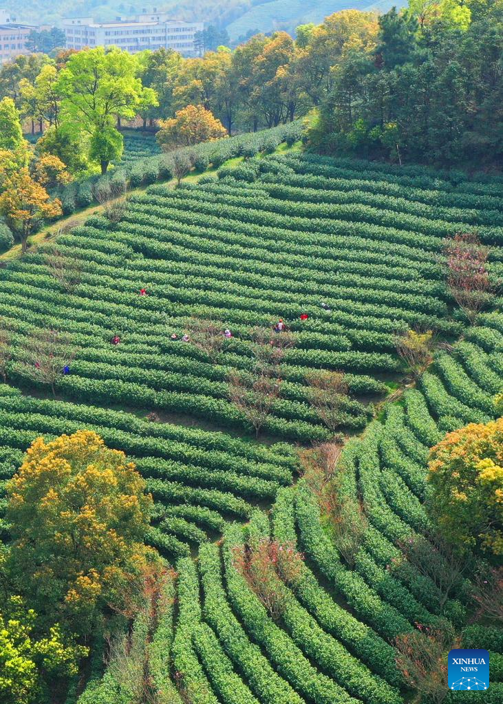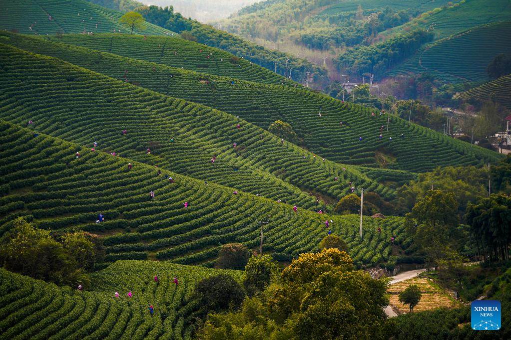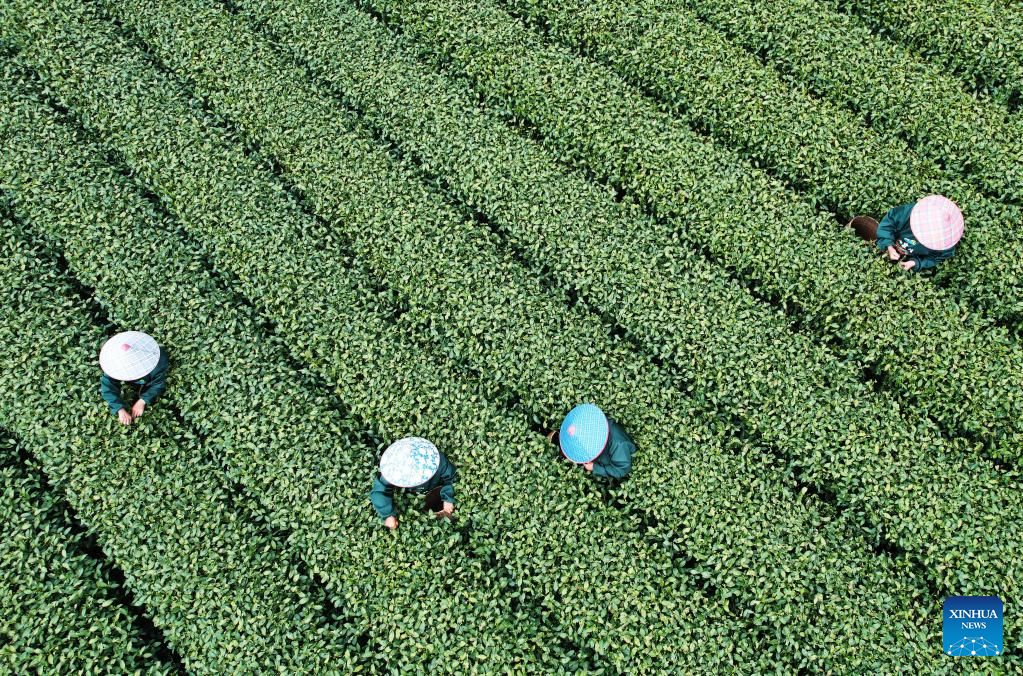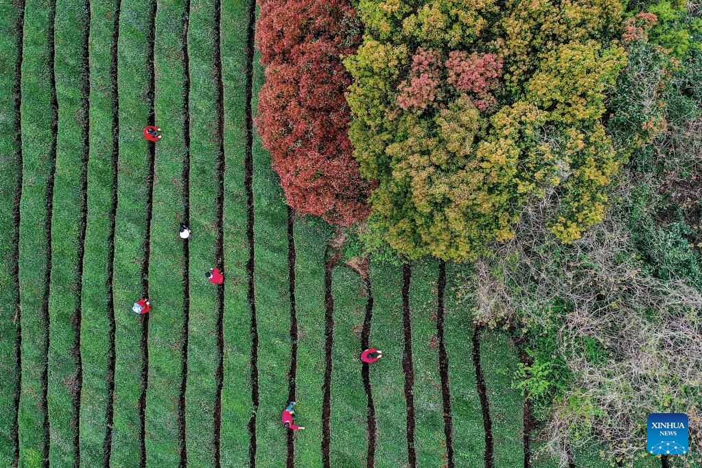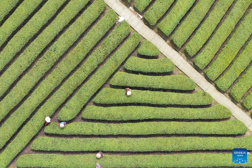 Aerial photo taken on March 30, 2022 shows farmers picking tea leaves at a tea garden in Huzhou, east China's Zhejiang Province. Traditionally, Chinese value tea made from the very first tea sprouts in spring that should be picked up before Qingming Festival, which falls on April 5 this year. (Photo by Yi Fan/Xinhua)