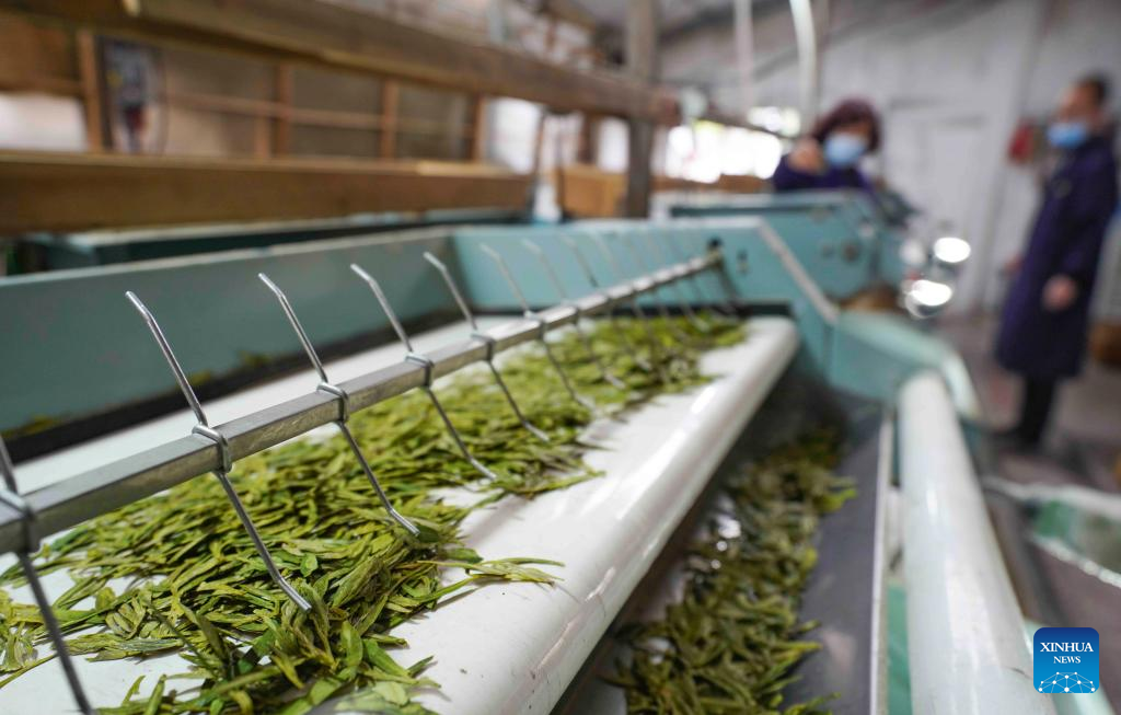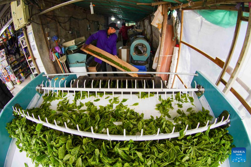 Farmers process tea leaves in Yongjia County of Wenzhou, east China's Zhejiang Province, March 28, 2022. Traditionally, Chinese value tea made from the very first tea sprouts in spring that should be picked up before Qingming Festival, which falls on April 5 this year. (Photo by Su Qiaojiang/Xinhua)
