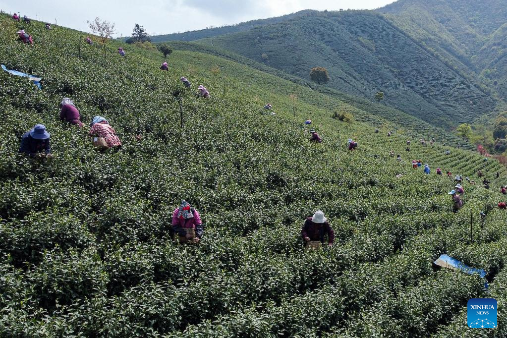 Photo taken on March 30, 2022 shows farmers picking tea leaves at a tea garden in Yiwu, east China's Zhejiang Province. Traditionally, Chinese value tea made from the very first tea sprouts in spring that should be picked up before Qingming Festival, which falls on April 5 this year. (Photo by Gong Xianming/Xinhua)