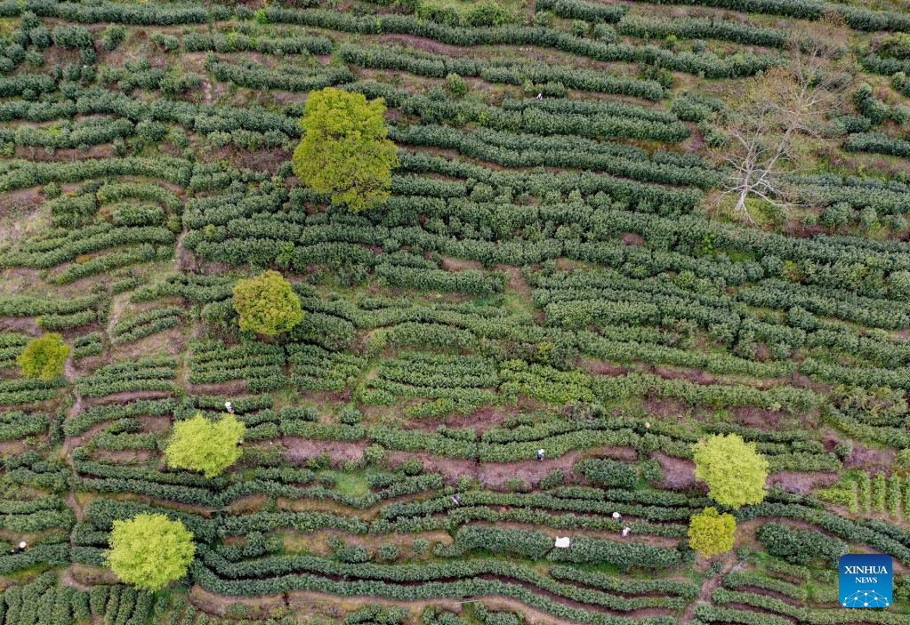 Aerial photo taken on March 30, 2022 shows farmers picking tea leaves at a tea garden in Anji County, east China's Zhejiang Province. Traditionally, Chinese value tea made from the very first tea sprouts in spring that should be picked up before Qingming Festival, which falls on April 5 this year. (Photo by Xia Pengfei/Xinhua)