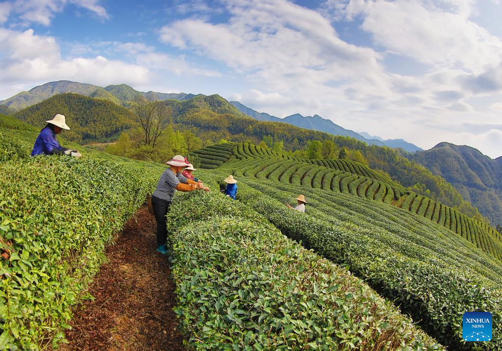 Photo taken on March 29, 2022 shows farmers picking tea leaves at a tea garden in Huzhou, east China's Zhejiang Province. Traditionally, Chinese value tea made from the very first tea sprouts in spring that should be picked up before Qingming Festival, which falls on April 5 this year. (Photo by Wu Zheng/Xinhua)