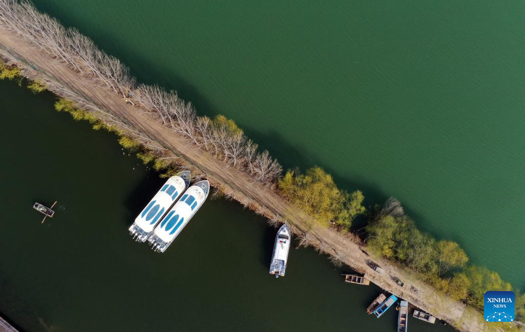 Aerial photo taken on March 28, 2022 shows a view of Baiyangdian Lake in Xiong'an New Area, north China's Hebei Province. Dubbed China's youngest city and a "city of the future," Xiong'an New Area marks its fifth anniversary on Friday. China announced plans to establish Xiong'an New Area on April 1, 2017, to relieve Beijing of functions non-essential to its role as the national capital and advance the coordinated development of the Beijing-Tianjin-Hebei region.By the end of 2021, construction has begun on 177 key projects in Xiong'an, with a total investment of 618.4 billion yuan (97.2 billion U.S. dollars). Sixty of them have been completed. So far, the major roads to the city, the main streets in the city, the Ecological Corridor, and the urban water system have taken shape.(Xinhua/Luo Xuefeng)