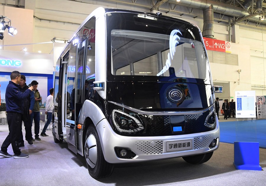 A self-driving bus is on display at World Intelligent Connected Vehicles Conference 2019 in Beijing, capital of China, Oct. 22, 2019. (Xinhua/Ren Chao)
