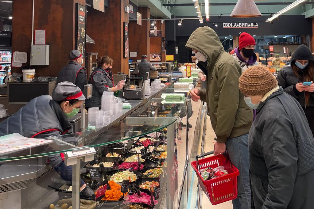 People go shopping at a supermarket in Lviv, Ukraine, Feb. 28, 2022. (Xinhua/Ren Ke)