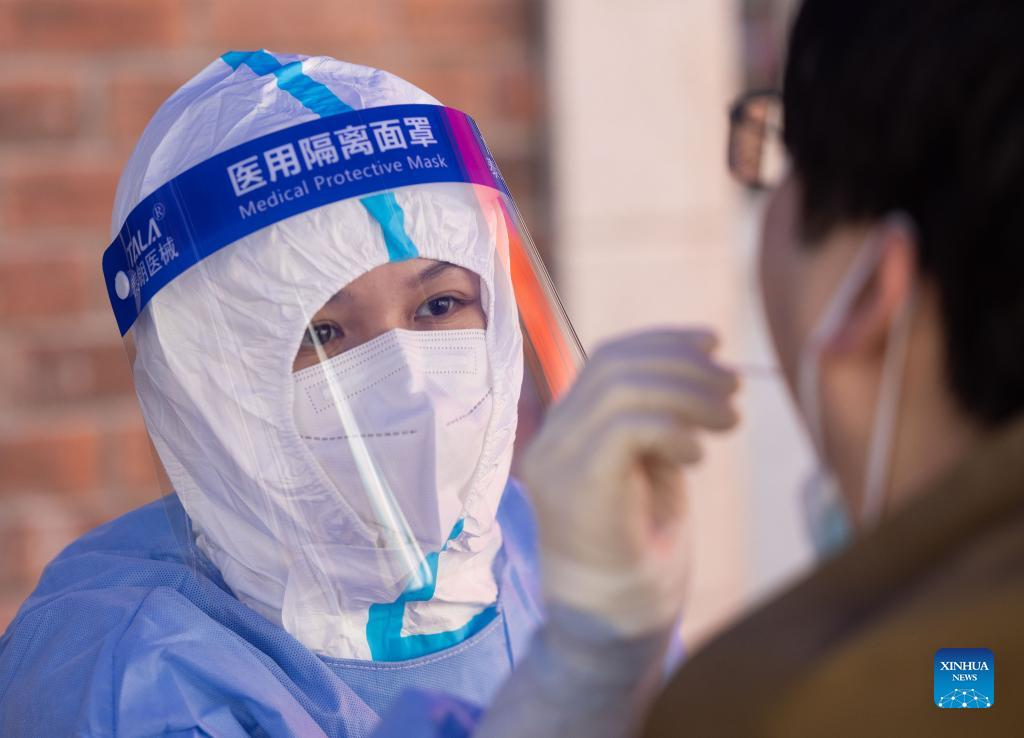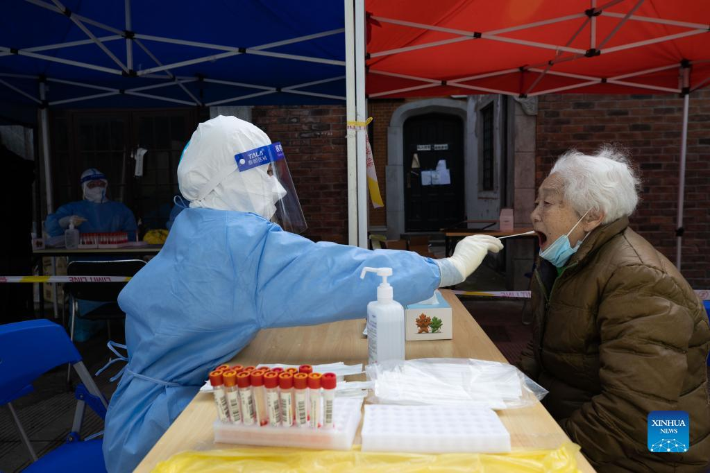 A medical worker takes a swab sample from a resident for nucleic acid test in Changning District of east China's Shanghai, April 1, 2022. Shanghai has launched a nucleic acid testing campaign in areas west of the Huangpu River from Friday amid the second phase of the city's closed-off management. (Xinhua/Jin Liwang)