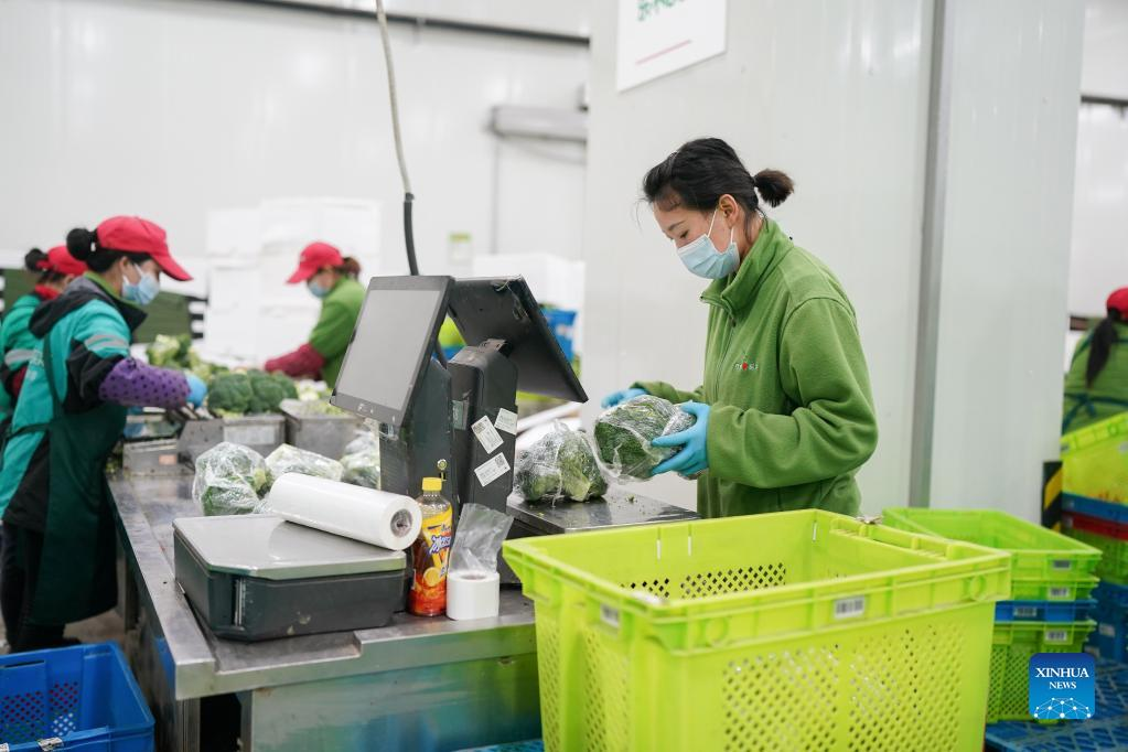 Staff process broccoli at a vegetable warehouse in the early morning in east China's Shanghai, April 1, 2022. The second phase of closed-off management in Shanghai has come into force in areas west of the Huangpu River on Friday amid a recent spike in COVID-19 infections, according to local authorities. As scheduled, nucleic acid testing will be held from Friday to April 5 for around 16 million people, and 12 districts will be put under temporary closed-off management. (Xinhua/Ding Ting)