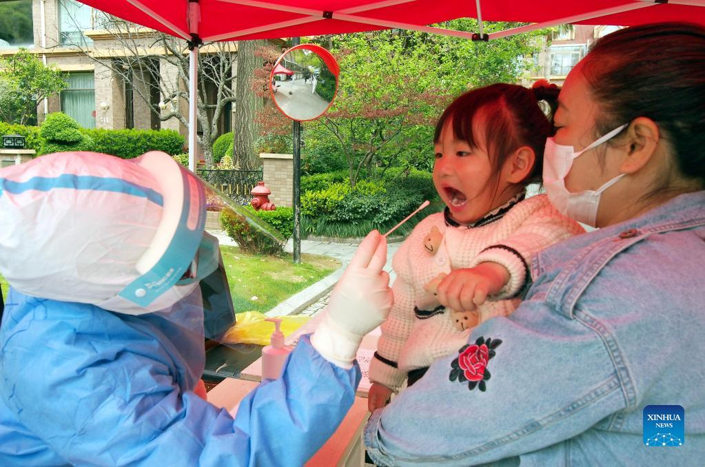 A medical worker takes a swab sample from a little girl for nucleic acid test in Minhang District of east China's Shanghai, April 1, 2022. The second phase of closed-off management in Shanghai has come into force in areas west of the Huangpu River on Friday amid a recent spike in COVID-19 infections, according to local authorities. As scheduled, nucleic acid testing will be held from Friday to April 5 for around 16 million people, and 12 districts will be put under temporary closed-off management. (Xinhua/Ren Long)