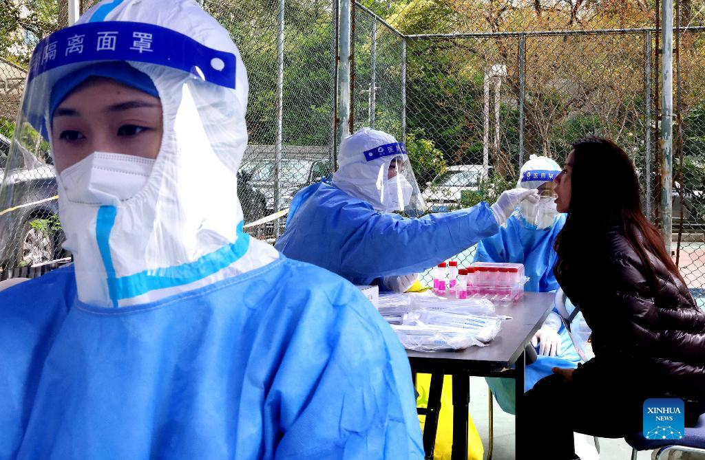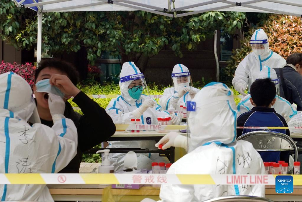 Medical staff take swab samples from residents for nucleic acid test at a residential community in Songjiang District of east China's Shanghai, April 1, 2022. The second phase of closed-off management in Shanghai has come into force in areas west of the Huangpu River on Friday amid a recent spike in COVID-19 infections, according to local authorities. As scheduled, nucleic acid testing will be held from Friday to April 5 for around 16 million people, and 12 districts will be put under temporary closed-off management. (Xinhua/Liu Ying)