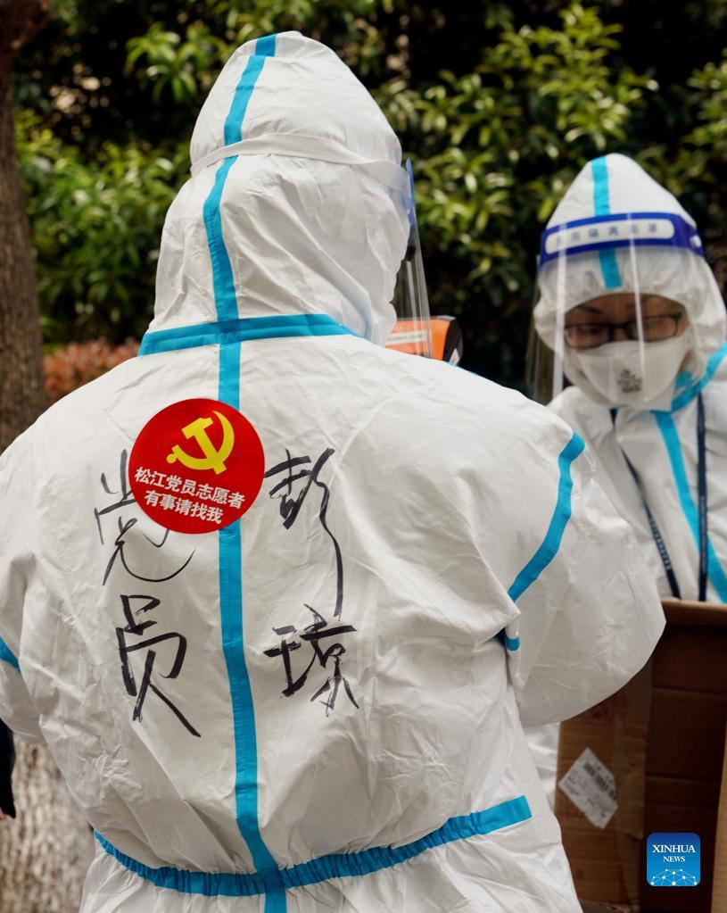 A volunteer works at a nucleic acid testing site within a residential community in Songjiang District of east China's Shanghai, April 1, 2022. The second phase of closed-off management in Shanghai has come into force in areas west of the Huangpu River on Friday amid a recent spike in COVID-19 infections, according to local authorities. As scheduled, nucleic acid testing will be held from Friday to April 5 for around 16 million people, and 12 districts will be put under temporary closed-off management. (Xinhua/Liu Ying)
