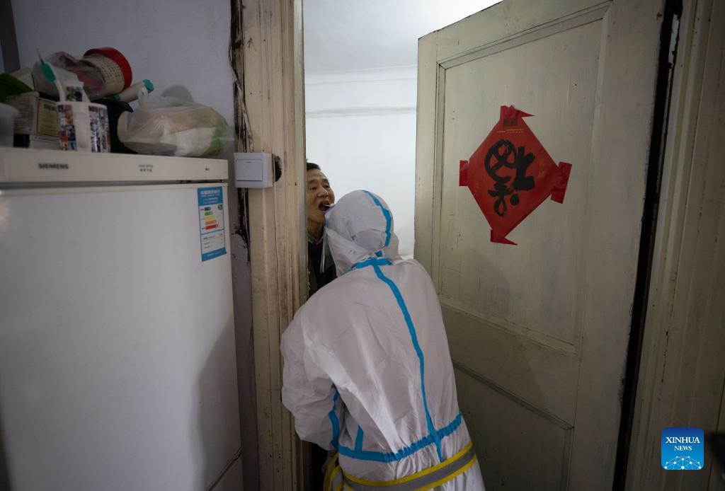 A medical worker takes a swab sample from a senior citizen for nucleic acid test in Changning District of east China's Shanghai, April 1, 2022. Shanghai has launched a nucleic acid testing campaign in areas west of the Huangpu River from Friday amid the second phase of the city's closed-off management. (Xinhua/Jin Liwang)