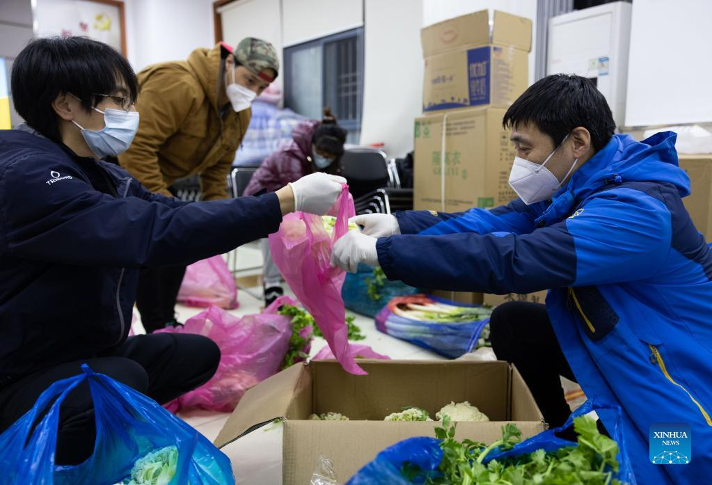 Community workers pack vegetables at a residential community during night time in east China's Shanghai, March 31, 2022. The second phase of closed-off management in Shanghai has come into force in areas west of the Huangpu River on Friday amid a recent spike in COVID-19 infections, according to local authorities. As scheduled, nucleic acid testing will be held from Friday to April 5 for around 16 million people, and 12 districts will be put under temporary closed-off management. (Xinhua/Jin Liwang)
