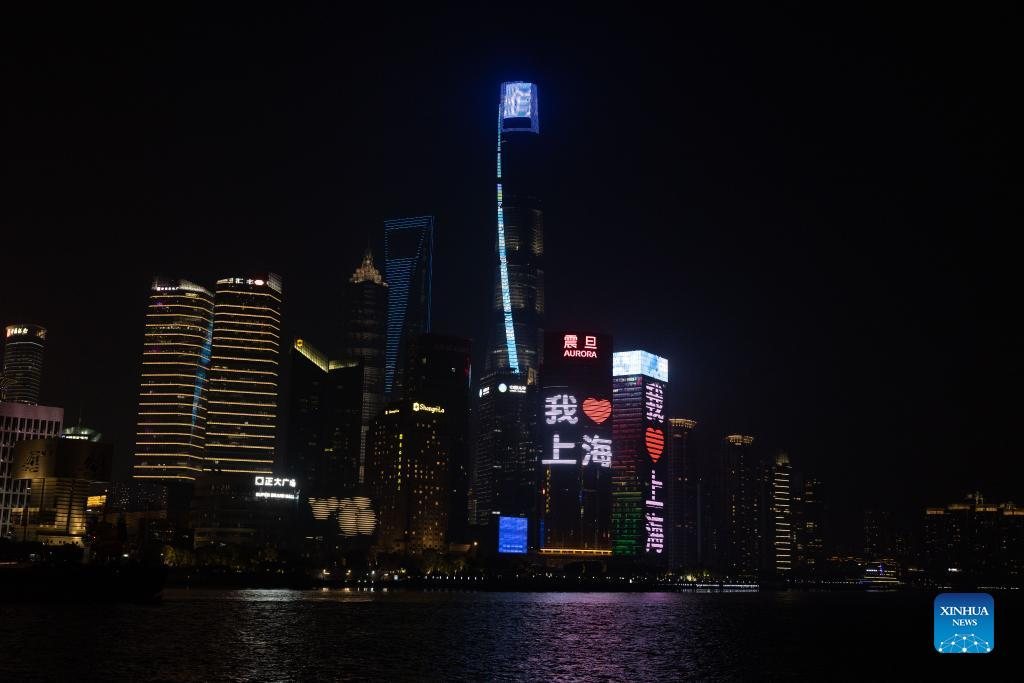 Photo taken on March 31, 2022 shows the night view of the Bund in east China's Shanghai. The second phase of closed-off management in Shanghai has come into force in areas west of the Huangpu River on Friday amid a recent spike in COVID-19 infections, according to local authorities. As scheduled, nucleic acid testing will be held from Friday to April 5 for around 16 million people, and 12 districts will be put under temporary closed-off management. (Xinhua/Chen Fei)