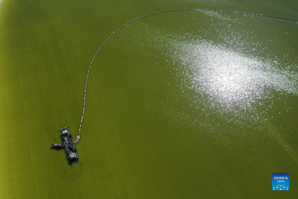 Aerial photo taken on April 1, 2022 shows a ship collecting crude salt on a salt lake in northwest China's Qinghai Province. Production of potash fertilizer is in full swing in Qinghai to help reinforce the spring farming. (Xinhua/Zhang Long)