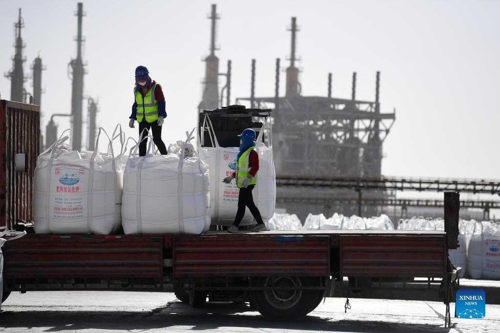 Staff members load potash fertilizer onto a truck at a potash fertilizer company in northwest China's Qinghai Province, April 1, 2022. Production of potash fertilizer is in full swing in Qinghai to help reinforce the spring farming. (Xinhua/Zhang Long)