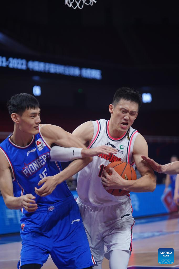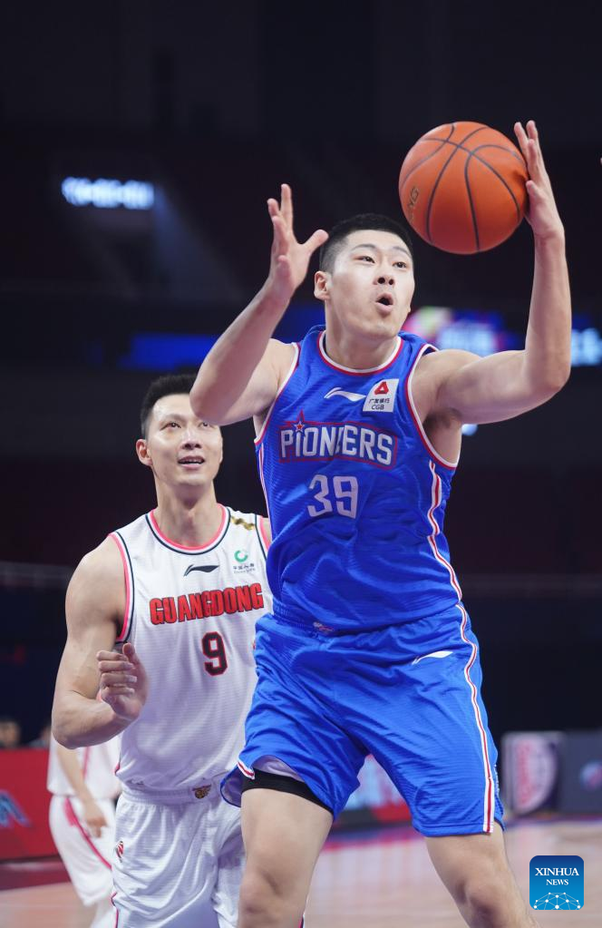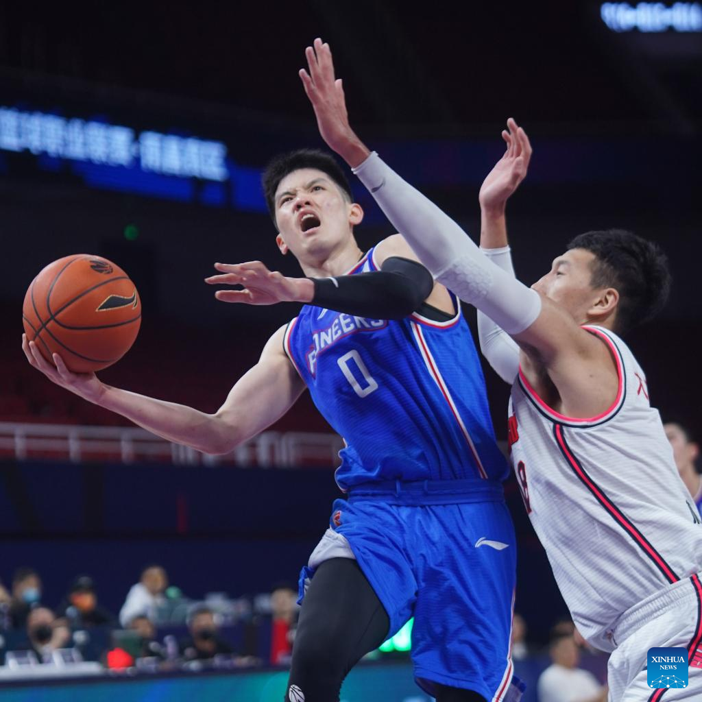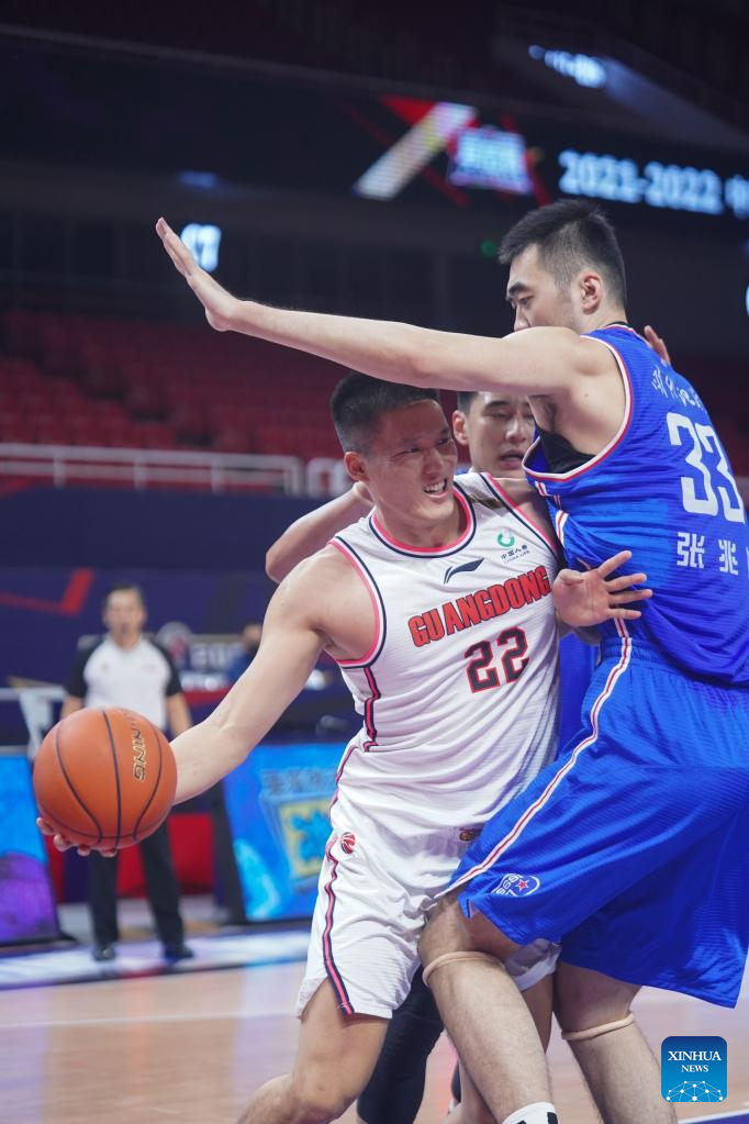 Zeng Fanri (L) of Guangdong Southern Tigers breaks through as Zhang Zhaoxu of Tianjin Pioneers defends during the 1st round playoff match between Guangdong Southern Tigers and Tianjin Pioneers at the 2021-2022 season of the Chinese Basketball Association (CBA) league in Nanchang, east China's Jiangxi Province, April 1, 2022. (Xinhua/Zhou Mi)