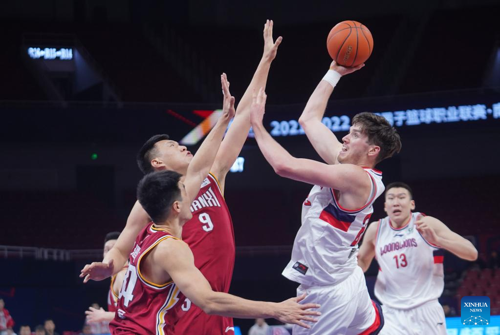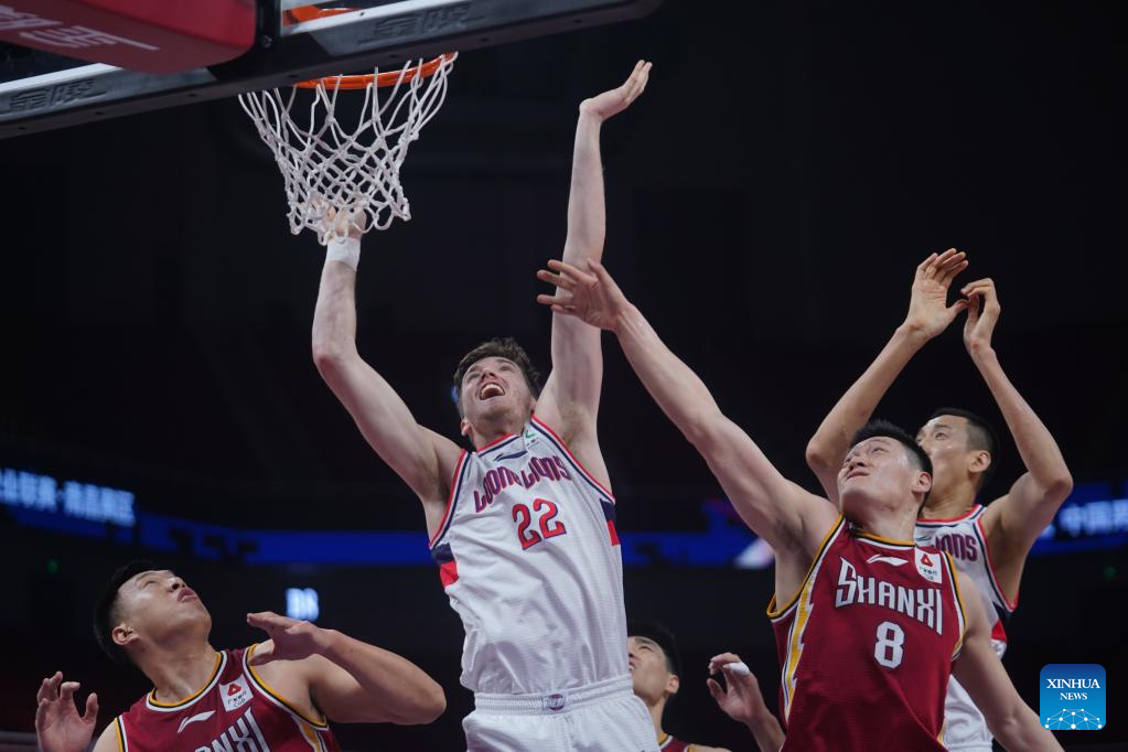 T.J. Leaf (2nd R) of Guangzhou Loong Lions goes for a lay-up during the 1st round playoff match between Guangzhou Loong Lions and Shanxi Loongs at the 2021-2022 season of the Chinese Basketball Association (CBA) league in Nanchang, east China's Jiangxi Province, April 1, 2022. (Xinhua/Zhou Mi)