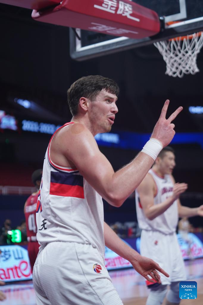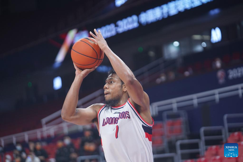 T.J. Leaf of Guangzhou Loong Lions gestures during the 1st round playoff match between Guangzhou Loong Lions and Shanxi Loongs at the 2021-2022 season of the Chinese Basketball Association (CBA) league in Nanchang, east China's Jiangxi Province, April 1, 2022. (Xinhua/Zhou Mi)