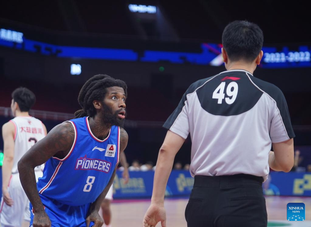 Kenny Boynton (L) of Tianjin Pioneers communicates with the referee during the 1st round playoff match between Guangdong Southern Tigers and Tianjin Pioneers at the 2021-2022 season of the Chinese Basketball Association (CBA) league in Nanchang, east China's Jiangxi Province, April 1, 2022. (Xinhua/Zhou Mi)