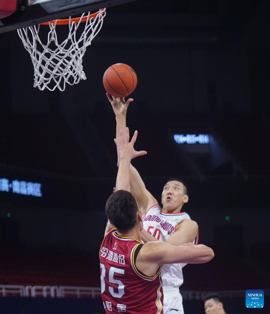 Zheng Zhun (R) of Guangzhou Loong Lions goes for a lay-up as Ge Zhaobao of Shanxi Loongs defends during the 1st round playoff match between Guangzhou Loong Lions and Shanxi Loongs at the 2021-2022 season of the Chinese Basketball Association (CBA) league in Nanchang, east China's Jiangxi Province, April 1, 2022. (Xinhua/Zhou Mi)