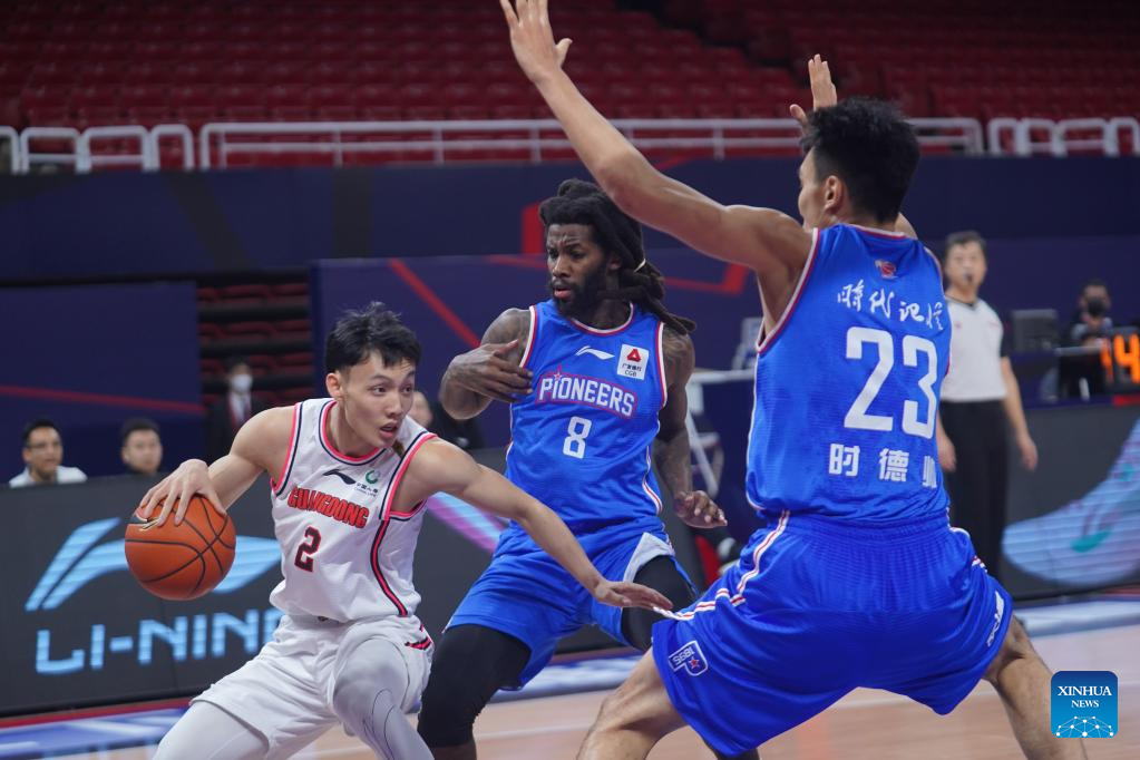 Xu Jie (L) of Guangdong Southern Tigers breaks through as Kenny Boynton (C) and Shi Deshuai of Tianjin Pioneers defend during the 1st round playoff match between Guangdong Southern Tigers and Tianjin Pioneers at the 2021-2022 season of the Chinese Basketball Association (CBA) league in Nanchang, east China's Jiangxi Province, April 1, 2022. (Xinhua/Zhou Mi)