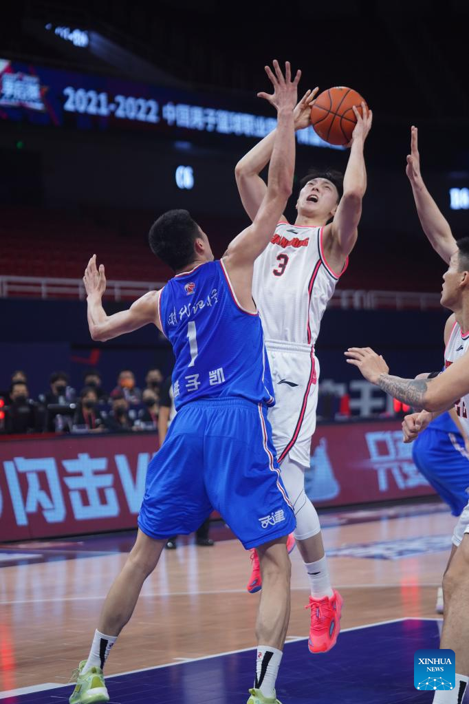 Lin Tingqian (L) of Tianjin Pioneers goes for a lay-up as Lin Runwang of Guangdong Southern Tigers defends during the 1st round playoff match between Guangdong Southern Tigers and Tianjin Pioneers at the 2021-2022 season of the Chinese Basketball Association (CBA) league in Nanchang, east China's Jiangxi Province, April 1, 2022. (Xinhua/Zhou Mi)