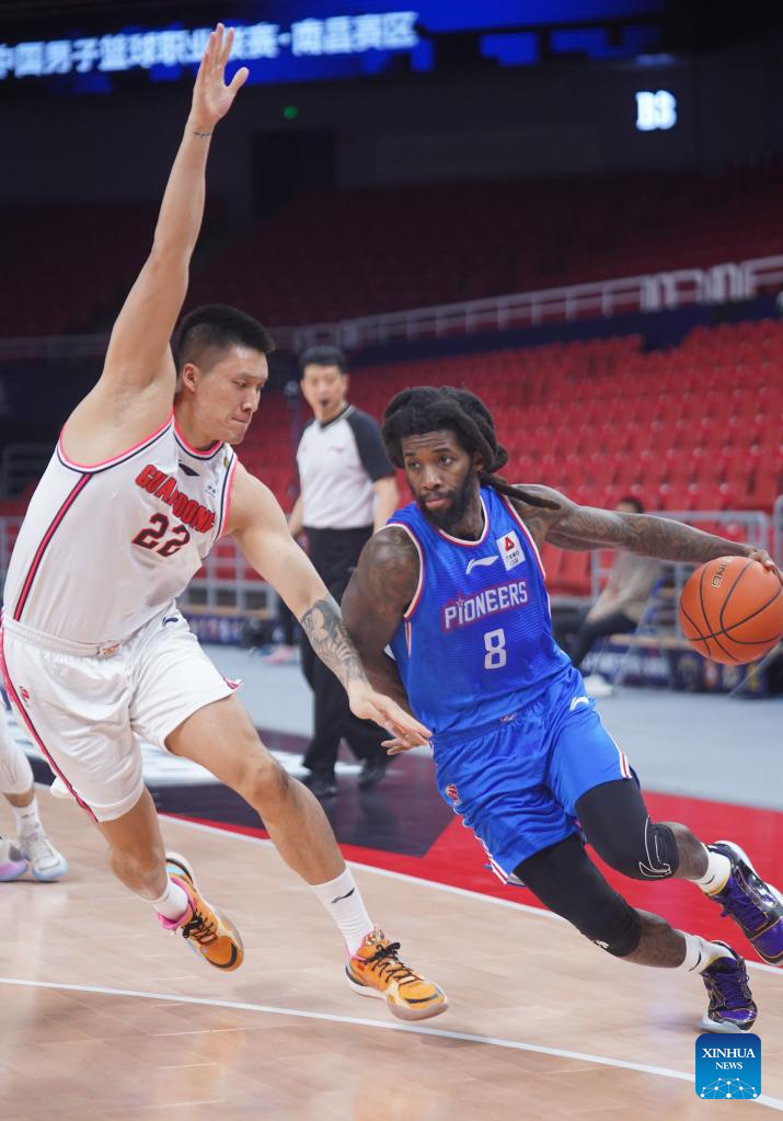 Kenny Boynton (R) of Tianjin Pioneers breaks through as Zeng Fanri of Guangdong Southern Tigers defends during the 1st round playoff match between Guangdong Southern Tigers and Tianjin Pioneers at the 2021-2022 season of the Chinese Basketball Association (CBA) league in Nanchang, east China's Jiangxi Province, April 1, 2022. (Xinhua/Zhou Mi)