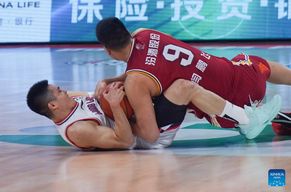 Chen Yingjun (L) of Guangzhou Loong Lions vies with Yan Pengfei Shanxi Loongs during the 1st round playoff match between Guangzhou Loong Lions and Shanxi Loongs at the 2021-2022 season of the Chinese Basketball Association (CBA) league in Nanchang, east China's Jiangxi Province, April 1, 2022. (Xinhua/Zhou Mi)