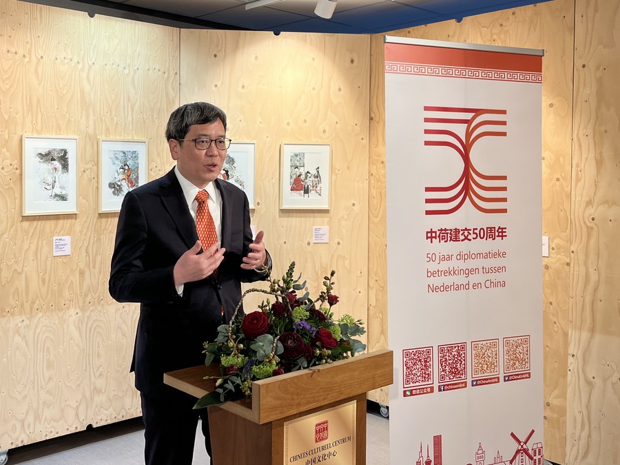 Chinese Ambassador to The Netherlands Tan Jian speaks at the launch of an exhibition entitled "An Artistic Dream of the Red Chamber" at the China Cultural Center in The Hague, The Netherlands, March 31, 2022. (Xinhua/Wang Xiangjiang)