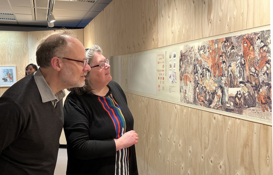 Dutch sinologists and translators Mark Leenhouts (L) and Anne Sytske Keijser appreciate a painting themed with the epic Chinese classic novel "Dream of the Red Chamber" at the China Cultural Center in The Hague, The Netherlands, March 31, 2022. (Xinhua/Wang Xiangjiang)