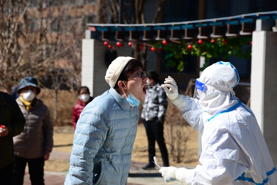A medical worker takes a swab sample from a resident for nucleic acid test at a COVID-19 testing site in Changchun, northeast China's Jilin Province, March 30, 2022. (Xinhua/Zhang Jian)