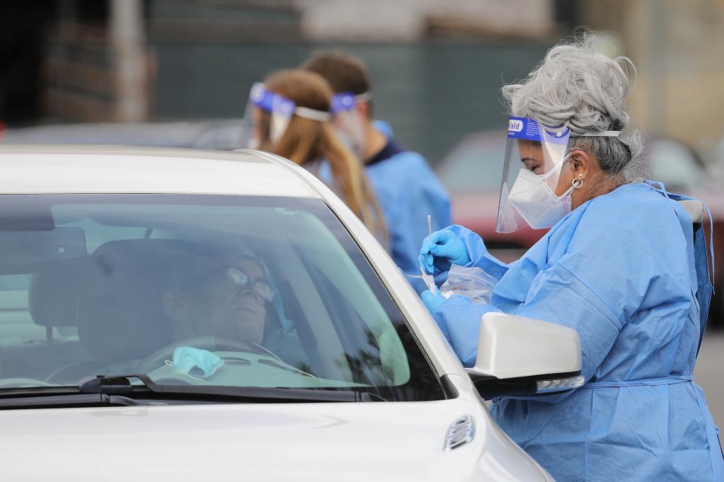 A medical worker collects a swab sample at a COVID-19 drive-through testing site in Los Angeles, California, the United States, Jan. 10, 2022. (Xinhua)