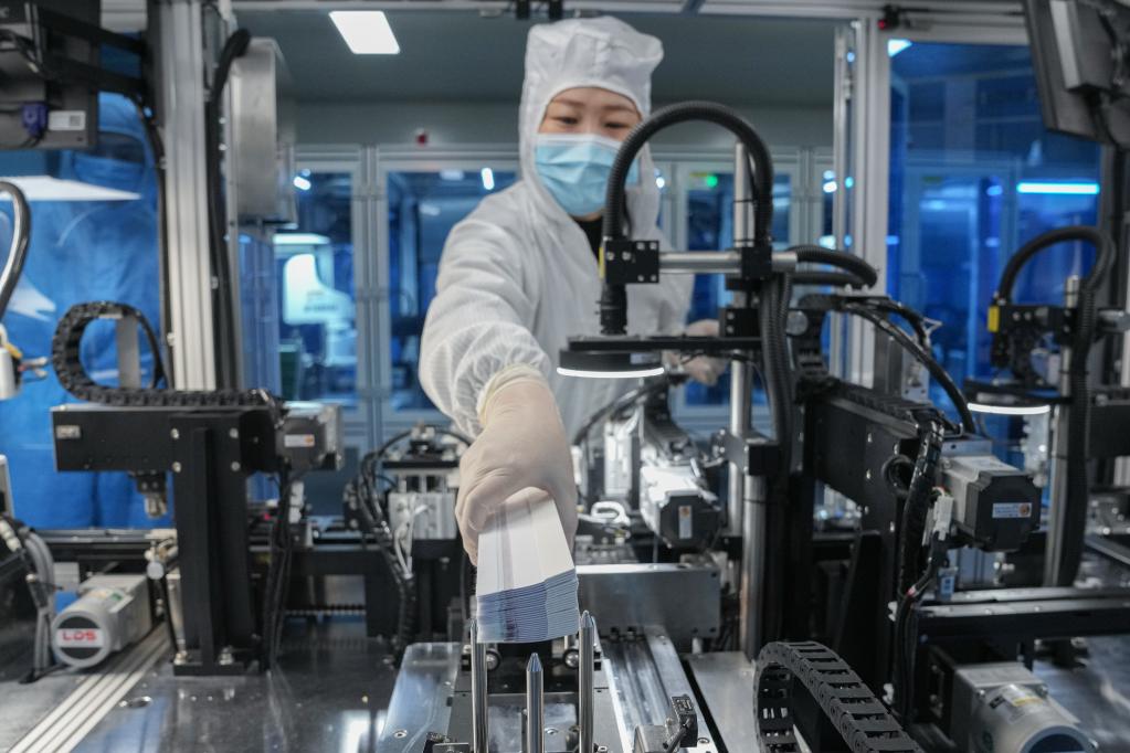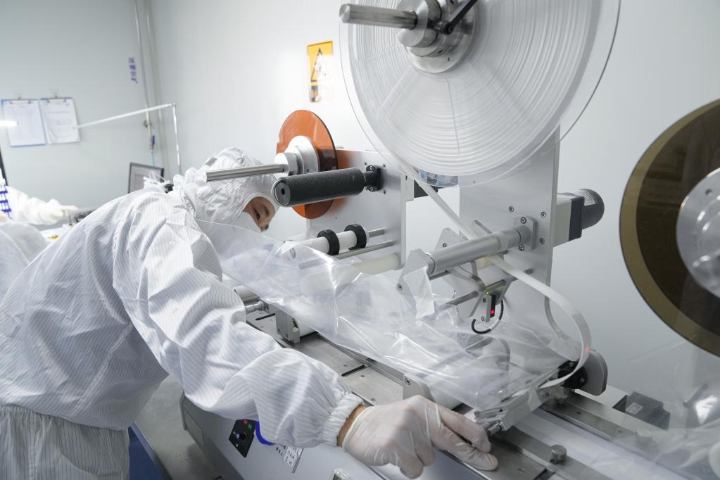 A staff member works at a production line of COVID-19 self-testing kits at Biouhan healthcare company in Hefei, east China's Anhui Province, March 29, 2022. Since March 11, China has added antigen detection as an option for COVID-19 testing among the public. Such kits are already seen in drug stores, online platforms and multiple detection scenarios in China. With a capacity of up to 10 million kits per day, Biouhan healthcare company is a major manufacturer of COVID-19 antigen self-testing kits in east China's Anhui Province. The testing kits have been used in transportation hubs in Hefei, Anhui Province. (Xinhua/Du Yu)