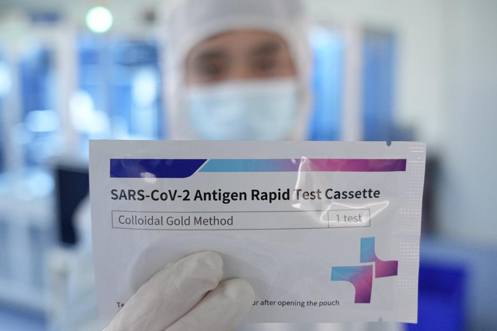 A staff member shows a COVID-19 antigen self-testing kit at Biouhan healthcare company in Hefei, east China's Anhui Province, March 29, 2022. Since March 11, China has added antigen detection as an option for COVID-19 testing among the public. Such kits are already seen in drug stores, online platforms and multiple detection scenarios in China. With a capacity of up to 10 million kits per day, Biouhan healthcare company is a major manufacturer of COVID-19 antigen self-testing kits in east China's Anhui Province. The testing kits have been used in transportation hubs in Hefei, Anhui Province. (Xinhua/Du Yu)