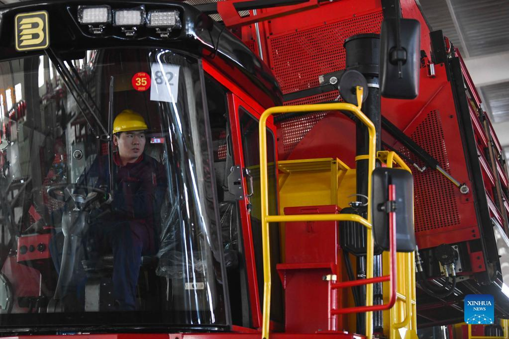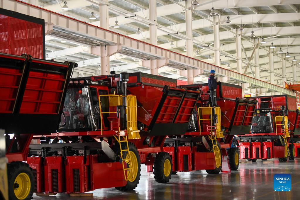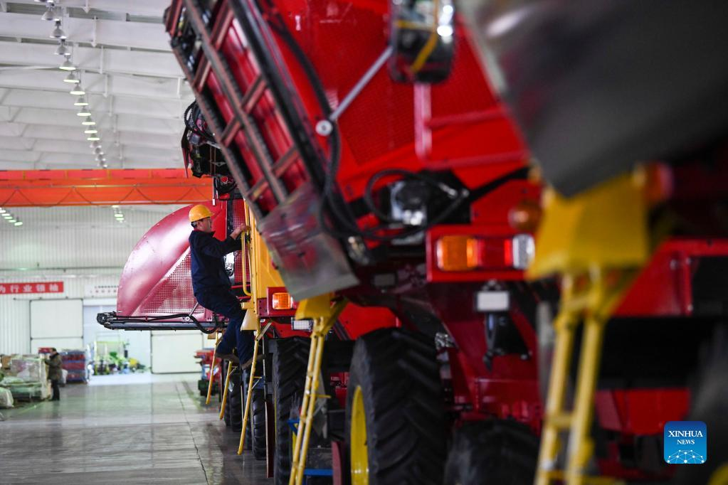 A worker inspects a cotton picker at Xinjiang Boshiran Intelligent Agricultural Machinery Co., Ltd. in Tacheng, northwest China's Xinjiang Uygur Autonomous Region, March 31, 2022. The production of domestically-made cotton pickers reaches its peak in Xinjiang as spring farming goes in full swing across the country. In 2021, machines performed over 80 percent of the cotton-picking work in the region, with the harvesting in northern Xinjiang nearly entirely mechanized, according to the regional agricultural authority. (Xinhua/Zhao Ge)