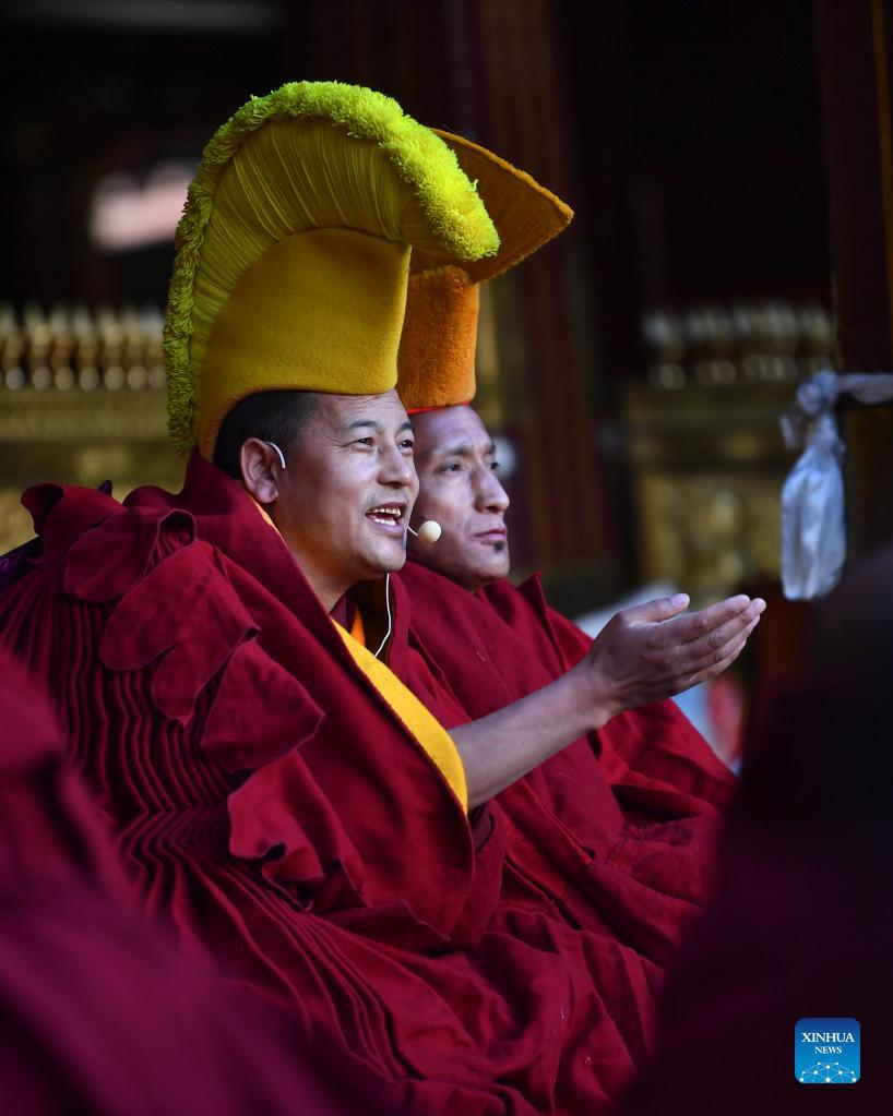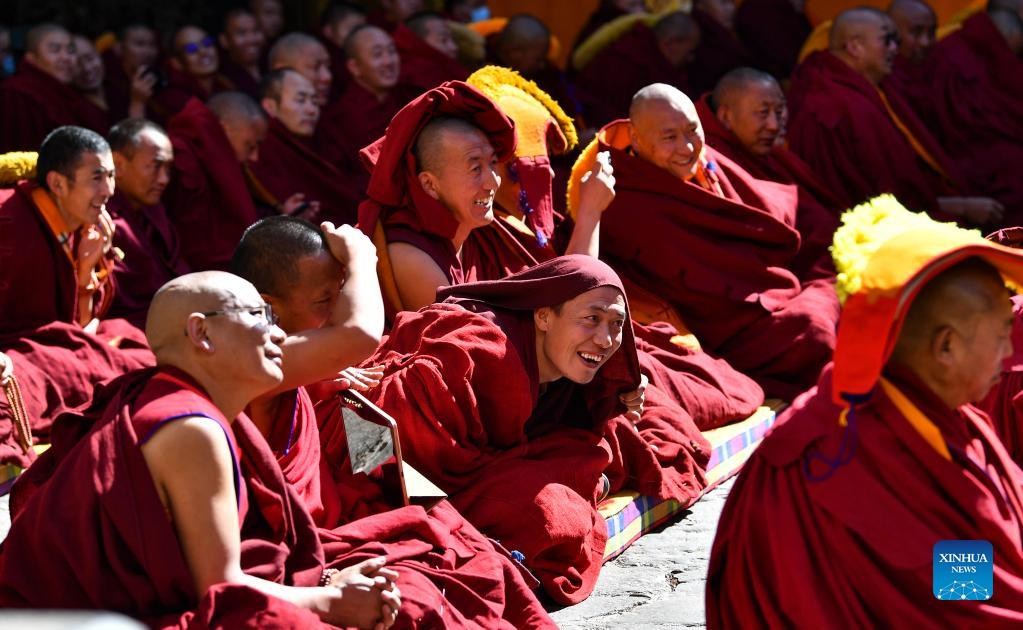 Monks attend the debate activity, a part of the award ceremony of the degree of Geshe Lharampa held in the Jokhang Temple in Lhasa, capital of southwest China's Tibet Autonomous Region, April 2, 2022. Thirteen monks were awarded the degree of Geshe Lharampa on Saturday in the Jokhang Temple in downtown Lhasa. Geshe Lharampa, which means "intellectual" in the Tibetan language, is the highest academic degree for the Gelugba School -- also known as the Yellow Sect -- of Tibetan Buddhism. The history of Geshe Lharampa goes back 400 years. (Xinhua/Jigme Dorje)