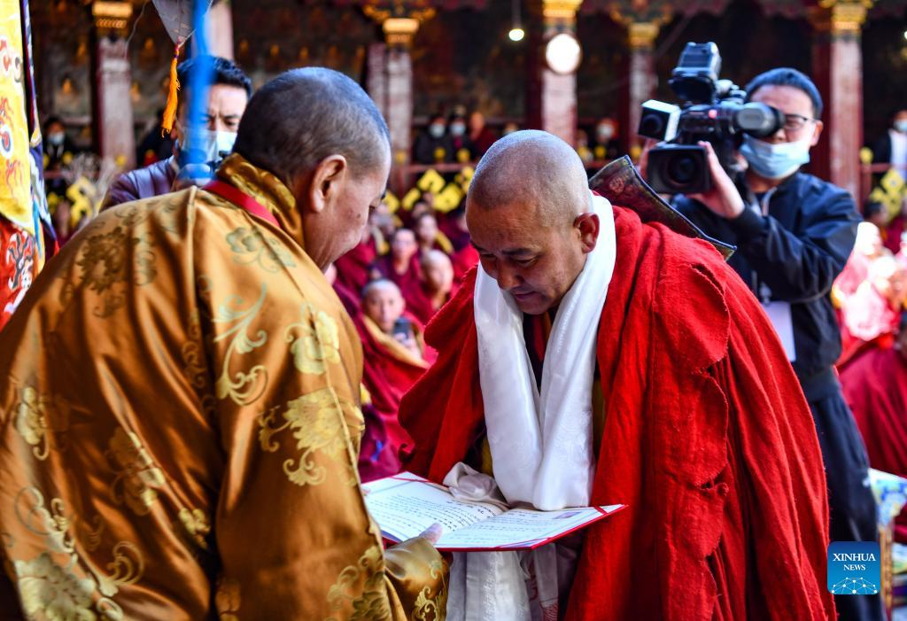 A monk is being awarded the degree of Geshe Lharampa in the Jokhang Temple in Lhasa, capital of southwest China's Tibet Autonomous Region, April 2, 2022. Thirteen monks were awarded the degree of Geshe Lharampa on Saturday in the Jokhang Temple in downtown Lhasa. Geshe Lharampa, which means "intellectual" in the Tibetan language, is the highest academic degree for the Gelugba School -- also known as the Yellow Sect -- of Tibetan Buddhism. The history of Geshe Lharampa goes back 400 years. (Xinhua/Jigme Dorje)