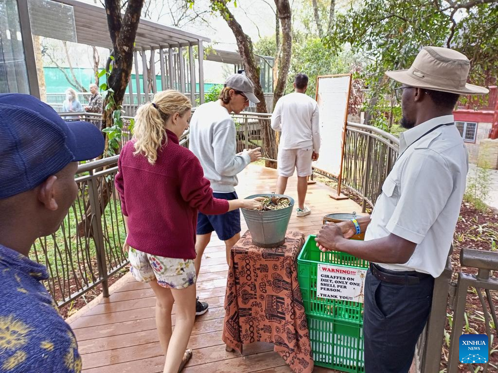 Tourists take food pellets to feed giraffes at the Giraffe Centre in Nairobi, Kenya, April 2, 2022. (Xinhua/Bai Lin)
