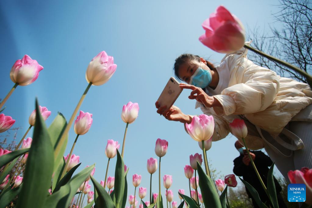 A tourist takes pictures of tulips at the Slender West Lake scenic spot in Yangzhou, east China's Jiangsu Province, April 3, 2022. (Photo by Meng Delong/Xinhua)