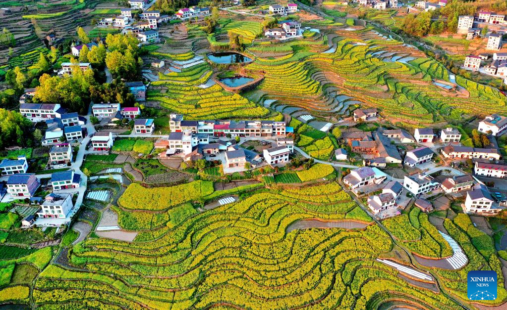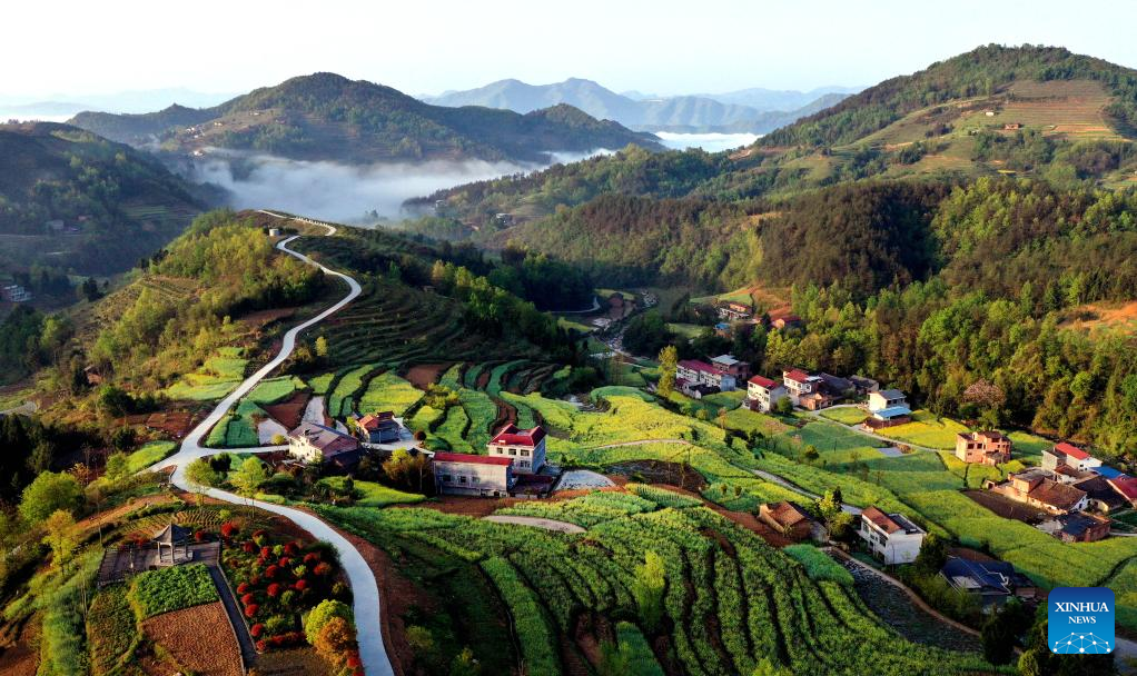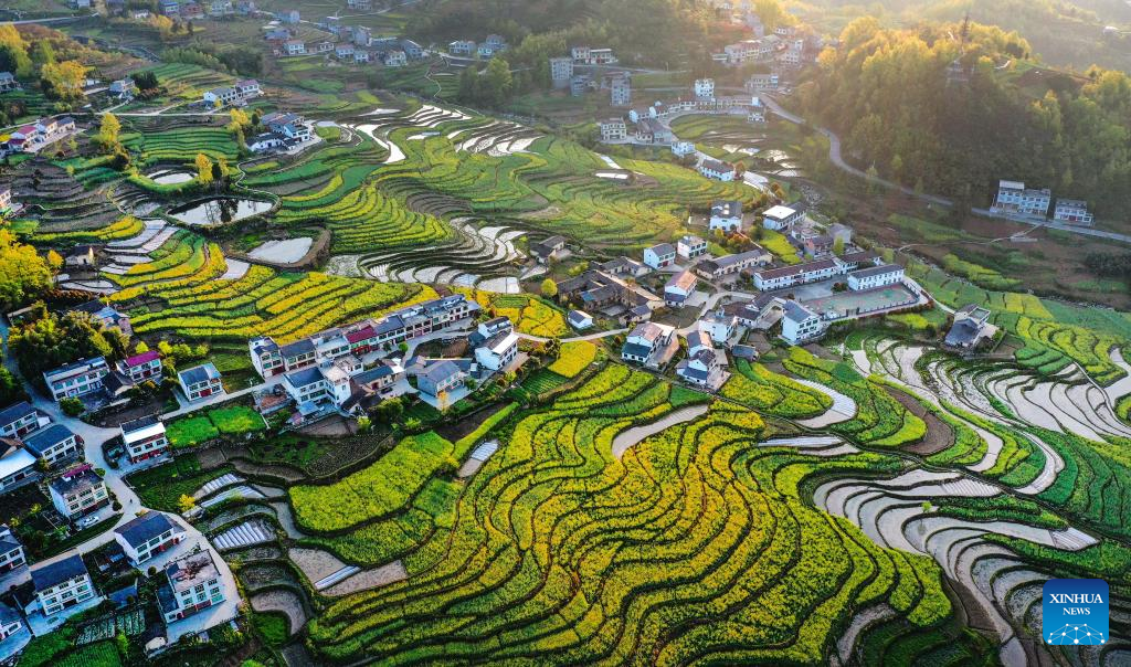 Aerial photo taken on April 3, 2022 shows the scenery of the terraced field in Ankang, northwest China's Shaanxi Province. (Xinhua/Tao Ming)