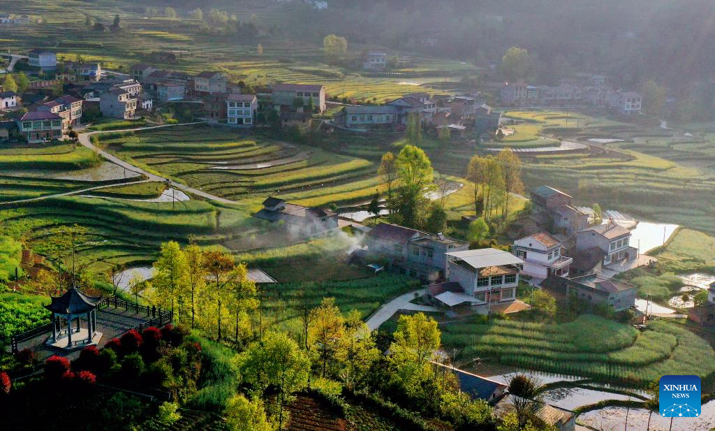 Aerial photo taken on April 2, 2022 shows the scenery of the terraced field in Ankang, northwest China's Shaanxi Province. (Xinhua/Tao Ming)