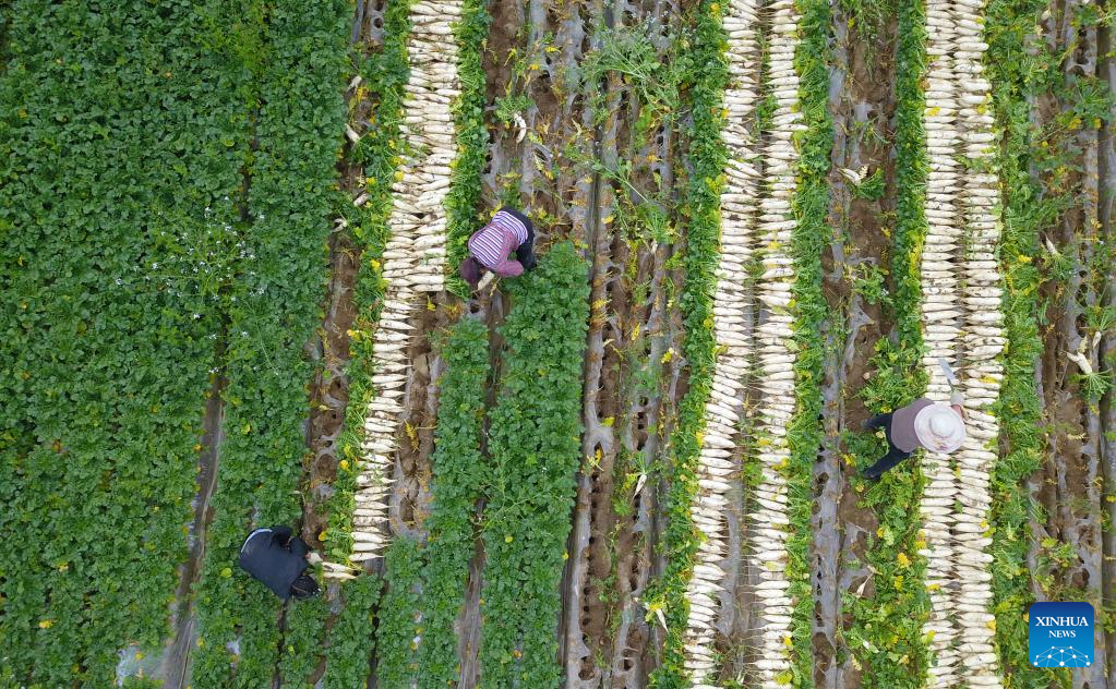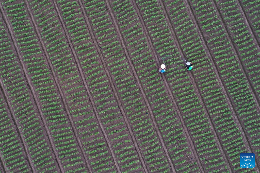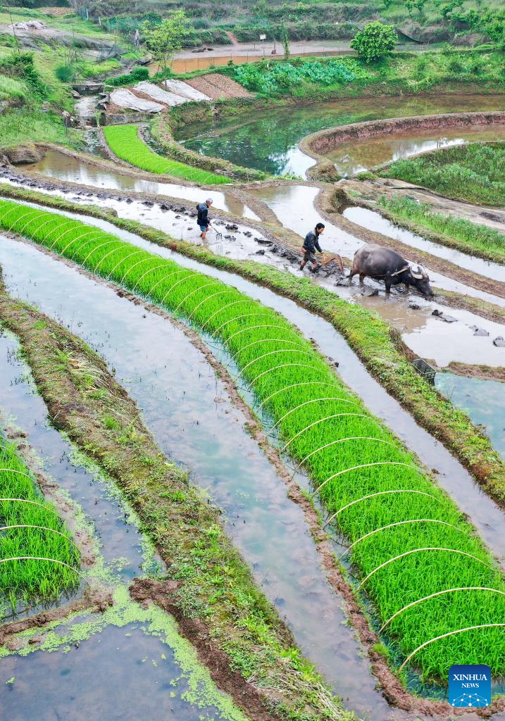 Aerial photo shows villagers working in the fields in Hexi Township of Nanchong, southwest China's Sichuan Province, April 4, 2022. As the temperature gradually rises around the time of Qingming Festival, farming activities are in full swing across the country, from the north to the south. (Photo by Yu Zhonghua/Xinhua)