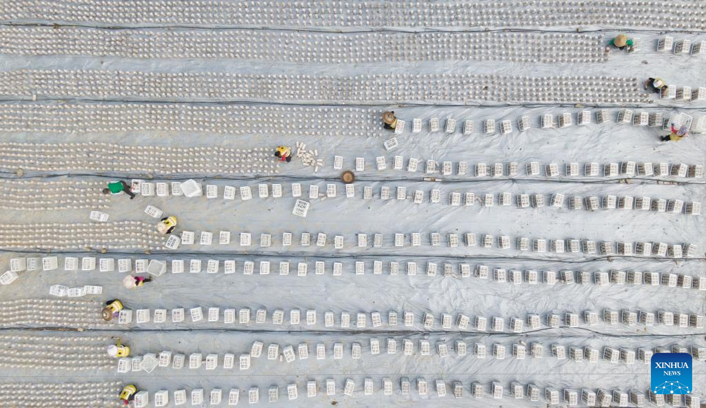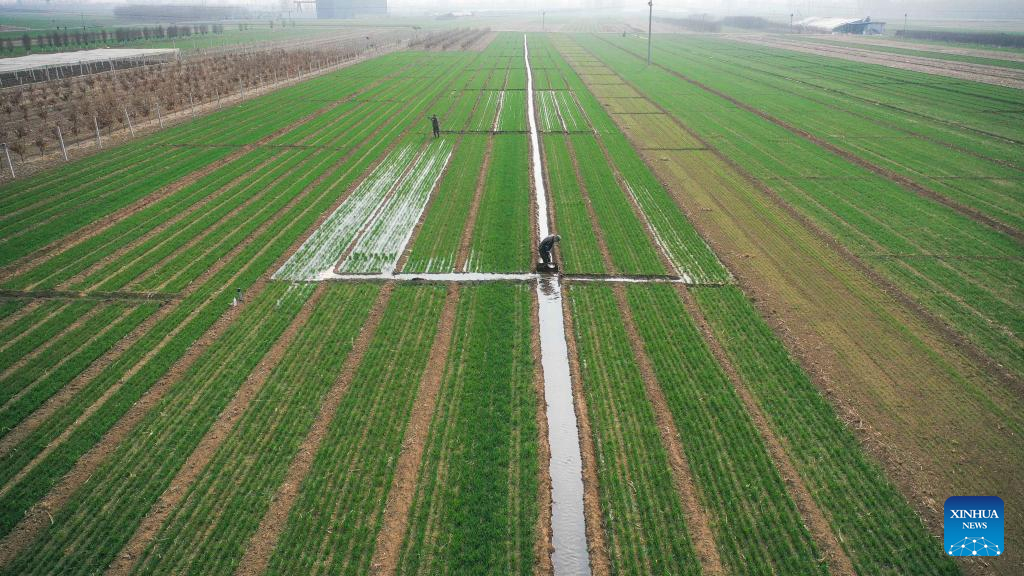 (220404) -- ZUNHUA, April 4, 2022 (Xinhua) -- Aerial photo shows villagers working in the fields in Xizhuang Village of Zunhua, north China's Hebei Province, April 4, 2022. As the temperature gradually rises around the time of Qingming Festival, farming activities are in full swing across the country, from the north to the south. (Photo by Liu Mancang/Xinhua)