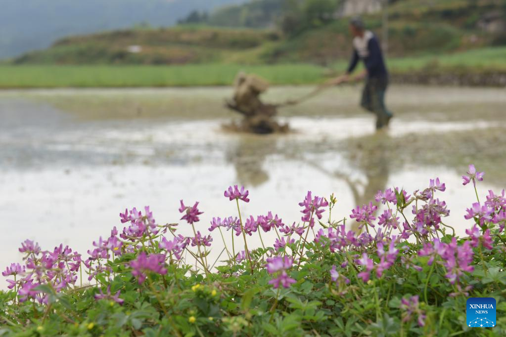 (220404) -- CENGONG, April 4, 2022 (Xinhua) -- A villager works in the fields in Zhouping Village of Cengong County, southwest China's Guizhou Province, April 4, 2022. As the temperature gradually rises around the time of Qingming Festival, farming activities are in full swing across the country, from the north to the south. (Photo by Tang Peng/Xinhua)