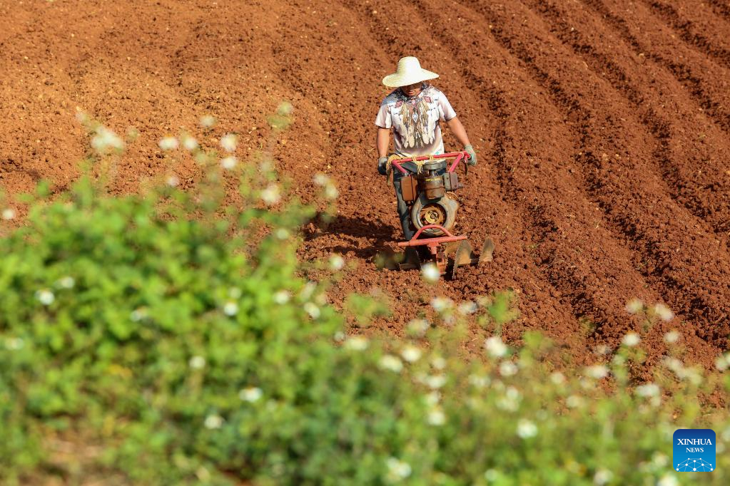 (220404) -- KAIYUAN, April 4, 2022 (Xinhua) -- A villager works in the fields in Yimin Village of Kaiyuan, southwest China's Yunnan Province, April 4, 2022. As the temperature gradually rises around the time of Qingming Festival, farming activities are in full swing across the country, from the north to the south. (Photo by Zhang Hongke/Xinhua)